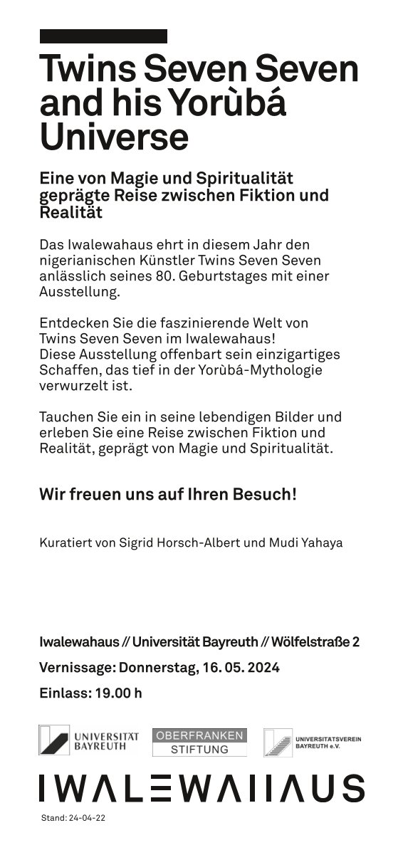 We would like to cordially invite you to the vernissage "Twins Seven Seven and his Yorùbá Universe" at the Iwalewahaus.
